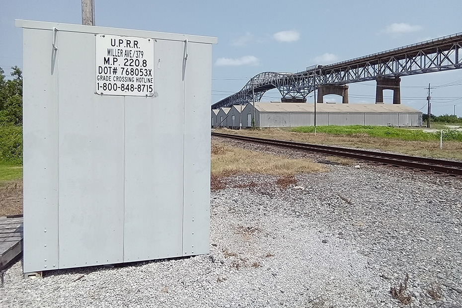 Just after 09:00, I rolled into Dequincy, and I saw something that I had never seen before, which is a Union Pacific Railroad train coming through Dequincy. I first spotted it when I was crossing the CPKC Lake Charles Subdivision on the highway crossing south of town and looked north toward the diamond, and, then, I was at the highway crossing rolling to a stop, because the train was blocking the crossing.