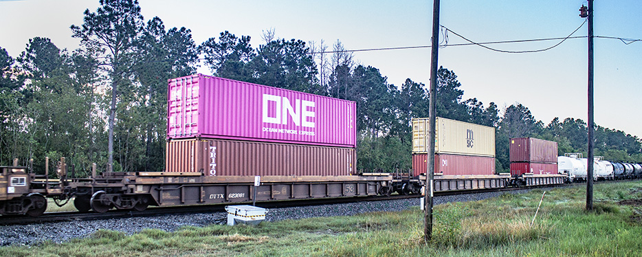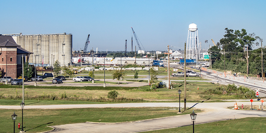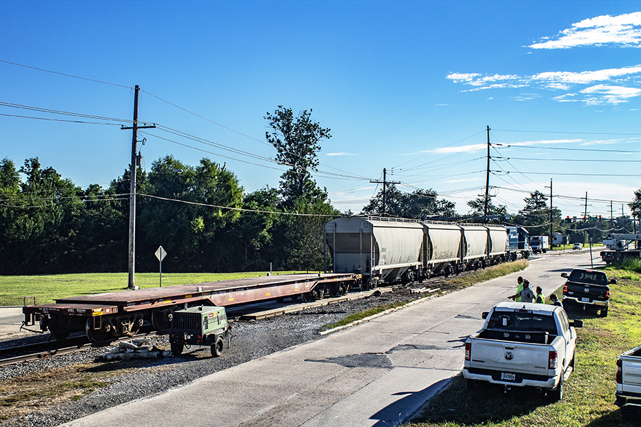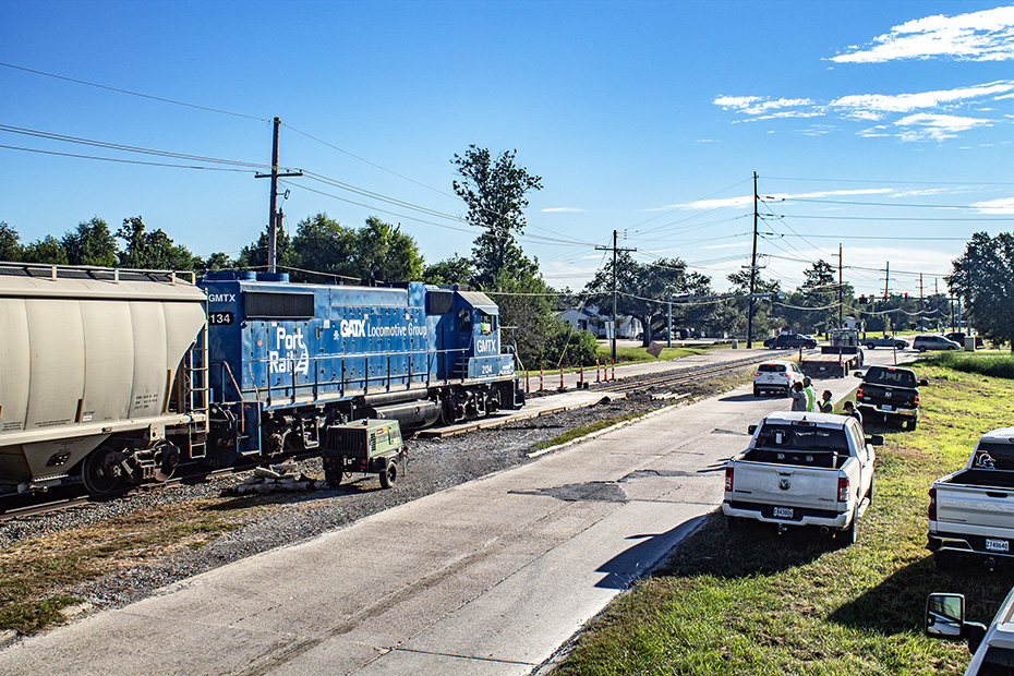 The big surprise is that the train had five passenger cars. So, yay, we’re back to having five passenger cars rather than just four on the Sunset Limited, and, now, I am realizing that maybe I should try to do this shot closer to the road so that maybe I can get this elevator thing into the shot. So, that’s a new perspective that I have; in fact, I will get on top of the truck right now and do it.