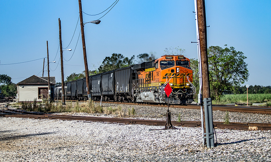 Here I am going over to the pilings, I guess, and I’ll put the telephoto lens on. Funny thing is that I was thinking just before I saw a headlight is that, okay, I guess that there will be a blog post today even if there are no trains, because it meets the criteria, because I did take some SLR-camera shots in Morgan City, but, now, I will have an action shot and may even have to post on the blog tonight.