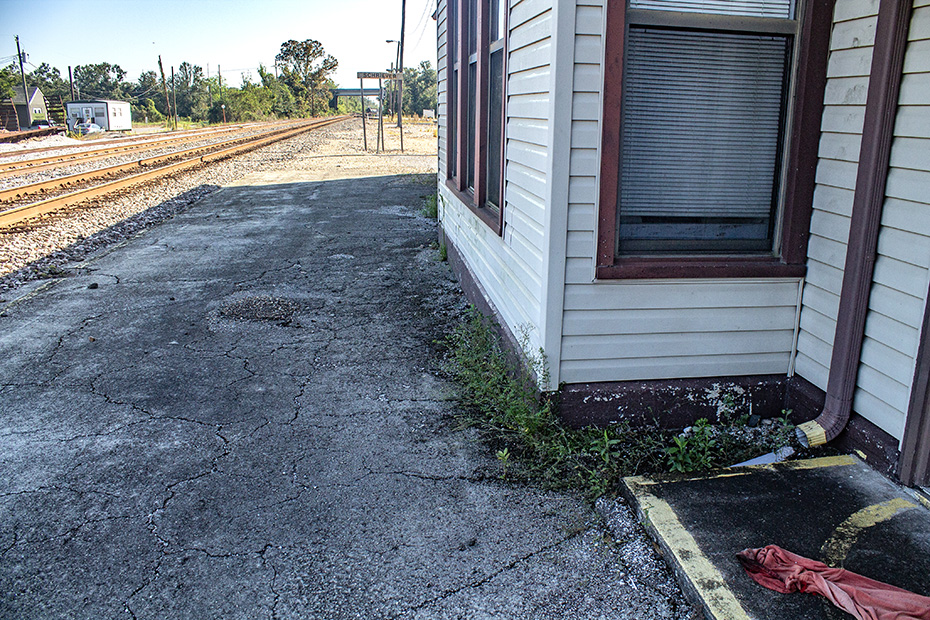 So, back by the depot after I got gasoline, I saw that there are weeds growing in the concrete and asphalt right here. It disappoints me. It’s good for the weeds, but I wish that it would clean up. Oh, I just noticed the absence of the Louisiana & Delta Railroad locomotive. The crew’s personal automobiles were there, and the locomotive were gone. Of course it would be, but I just didn’t think of it earlier. They probably were working at around Raceland somewhere.