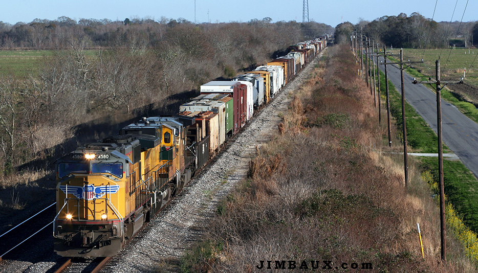 Later, I got a great shot of UP train MNOEW-10, which Brown and I had watched at the west end of Schriever earlier, passing the Bayou Sale siding.